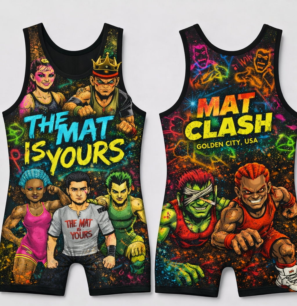 The MAT CLASH Universe™ Graffiti Singlet brings the energy of the streets to the center of the mat. Featuring bold graffiti artwork, iconic MAT CLASH characters, and the message THE MAT IS YOURS, this youth singlet is built for wrestlers who compete with confidence, edge, and purpose.